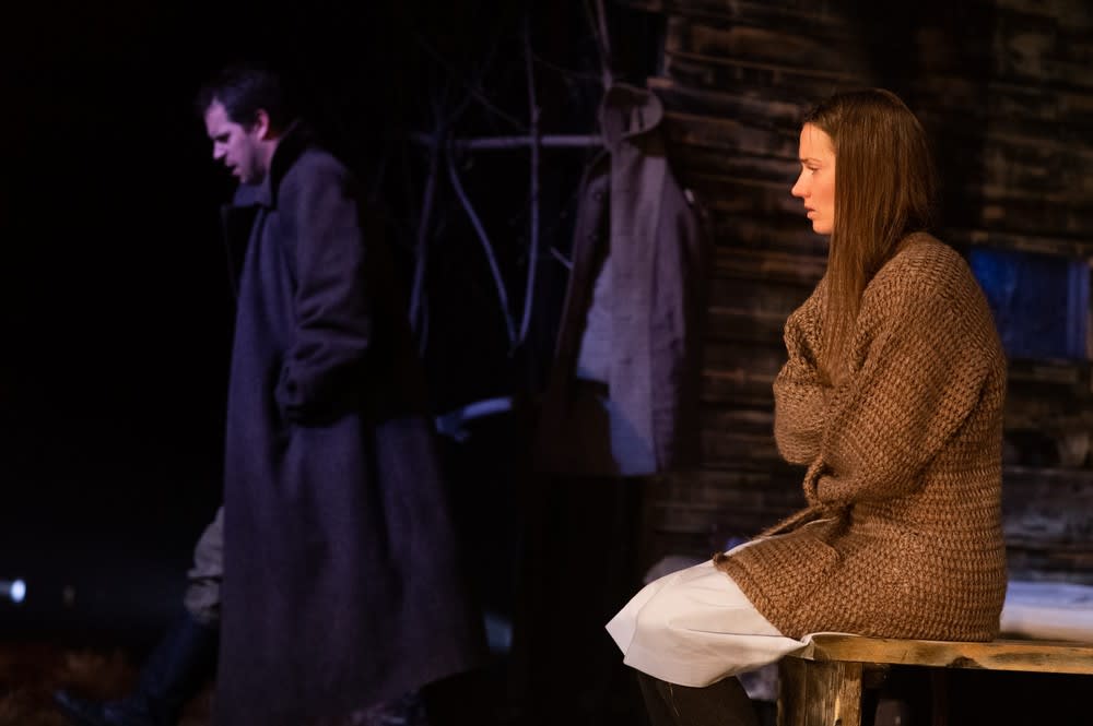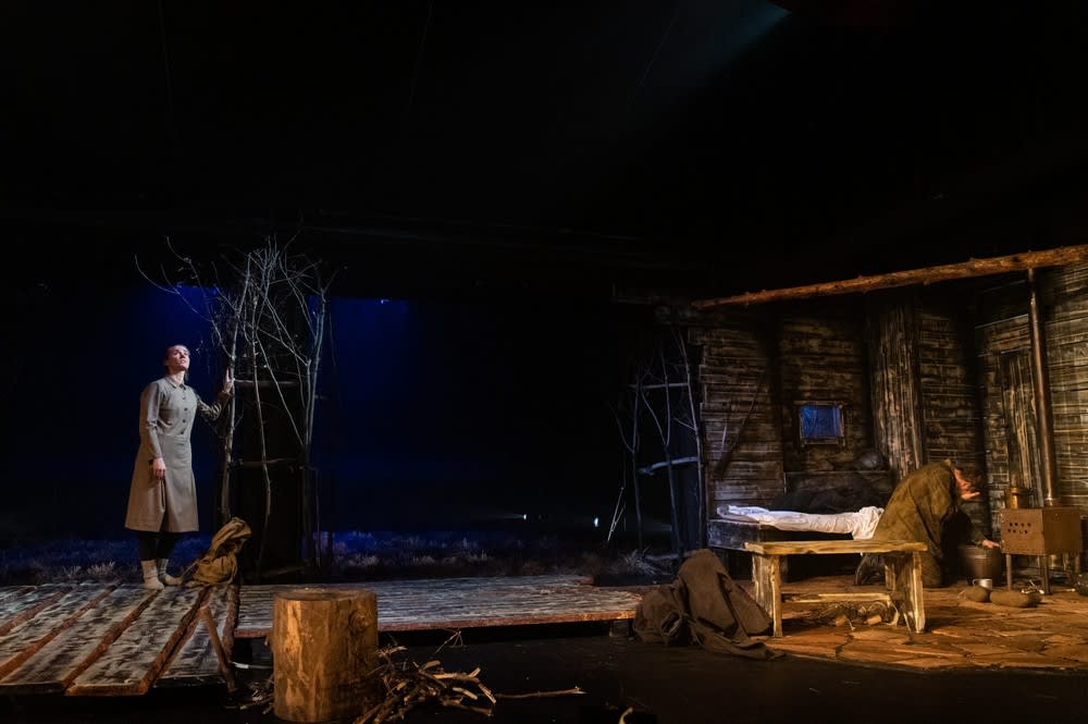 Действие постановки разворачивается среди аскетичных, но выразительных декораций, созданных главным художником театра Александром Плинтом. Справа мы видим убранство то ли зимовья, то ли бани: выцветшие от времени деревянные стены и полати, пол из песчаника, печка-буржуйка. Слева – деревянный сарай, мостик и небольшой пруд. Внутри сцены – поле желтой травы и экран, где то и дело возникают пейзажи сибирской природы и кадры из фильмов о военном времени.