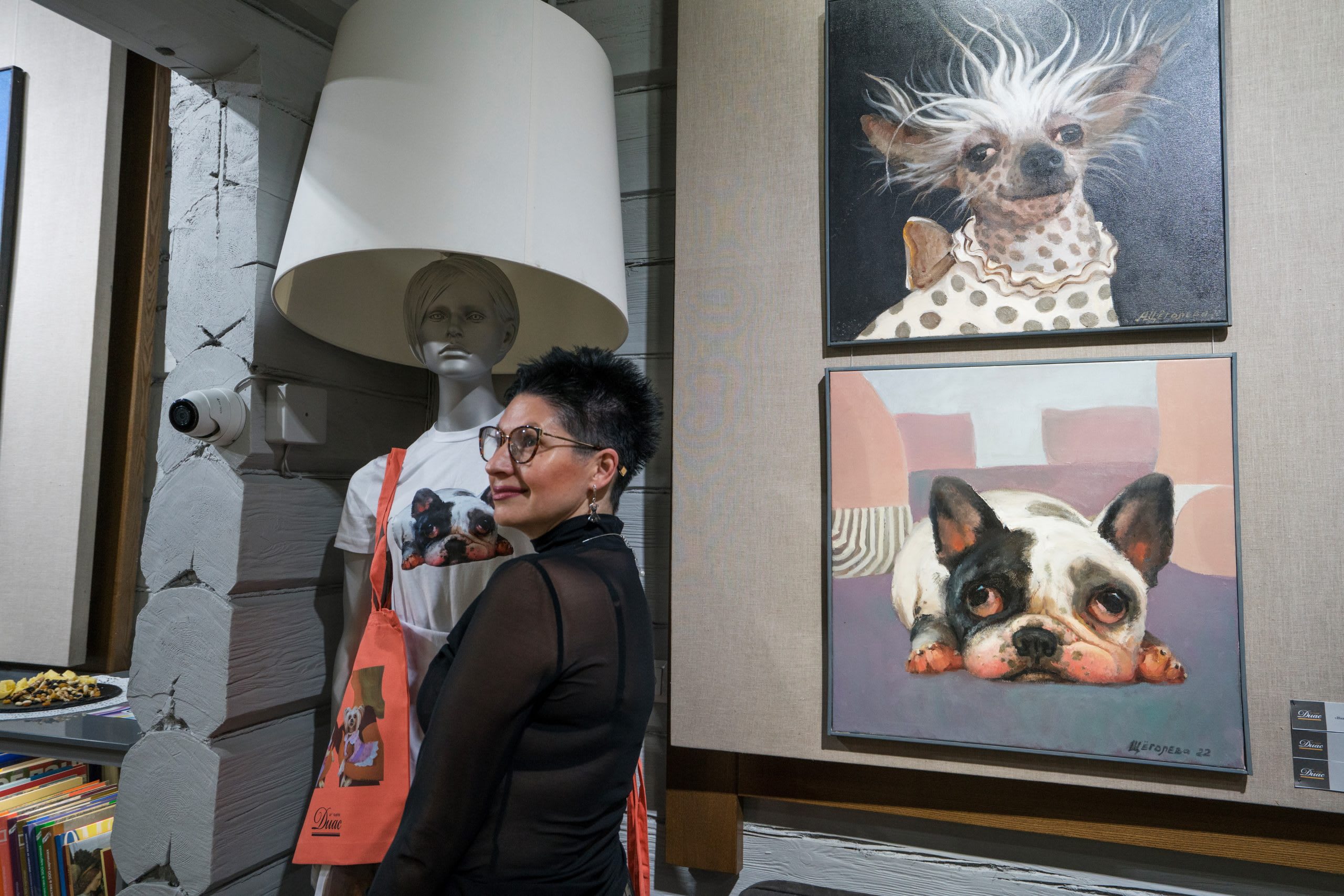 – Картины, где рамы, – это форточки открывают мамину серию про животных «Характеры. Все как у людей», Кстати, у меня есть книга детских стихов «Все как у зверей», – рассказала Александра Щеголева. – Вот работа «Мы», где французский бульдог сидит на кровати в задумчивости между спинами хозяев. Работа «Променад», которая стала символом выставки, показывает собак, так похожих на своих хозяек. Кстати, они здесь – лишь фон для выразительных питомцев. Есть миниатюры «Диета», где хозяйка и мопс смотрят с тоской на кастрюльку с шашлыком, «Гости», в которой пес под столом неодобрительно косится на мужчину, который положил руку на коленку его хозяйки.