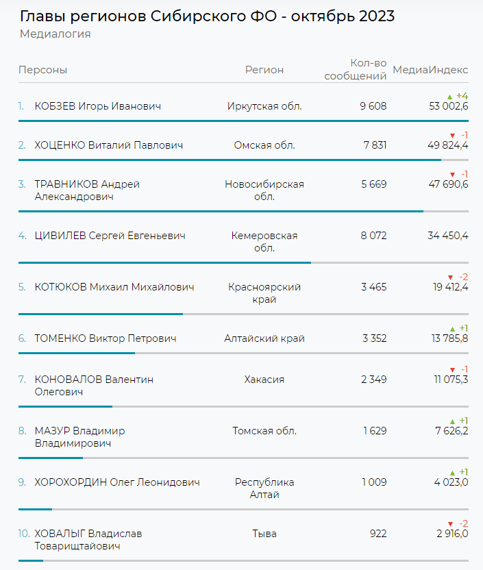 Игорь Кобзев улучшил свои позиции сразу на четыре пункта. Главу региона упоминали в медиа 9 608 раз, медиаиндекс превысил 53 тысячи пунктов.