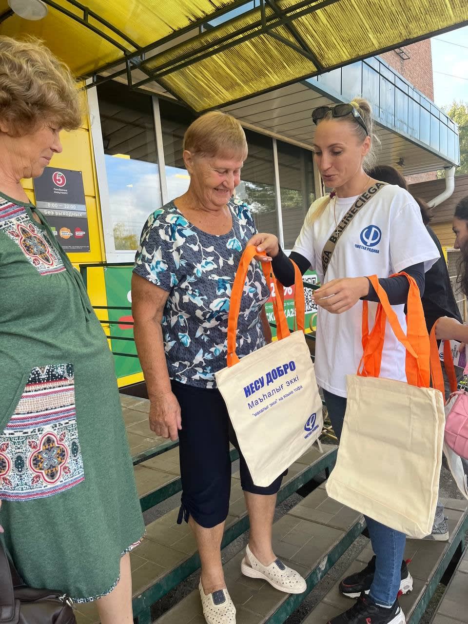 В августе «Чистая родина» провела одну из самых ярких акций. Волонтеры вышли на улицы города и раздавали местным жителям экосумки с надписью «Несу добро» на русском и тофаларском языках.
