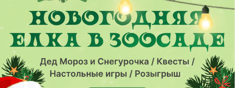 Новогодняя елка в зоосаде. В 13:00 пройдет викторина о животных. В 14:00 придут Дед Мороз и Снегурочка. С 15:00 начнется розыгрыш подарков. Стоимость билетов от 300 рублей. Вопросы можно задать по телефону: 89642112462.