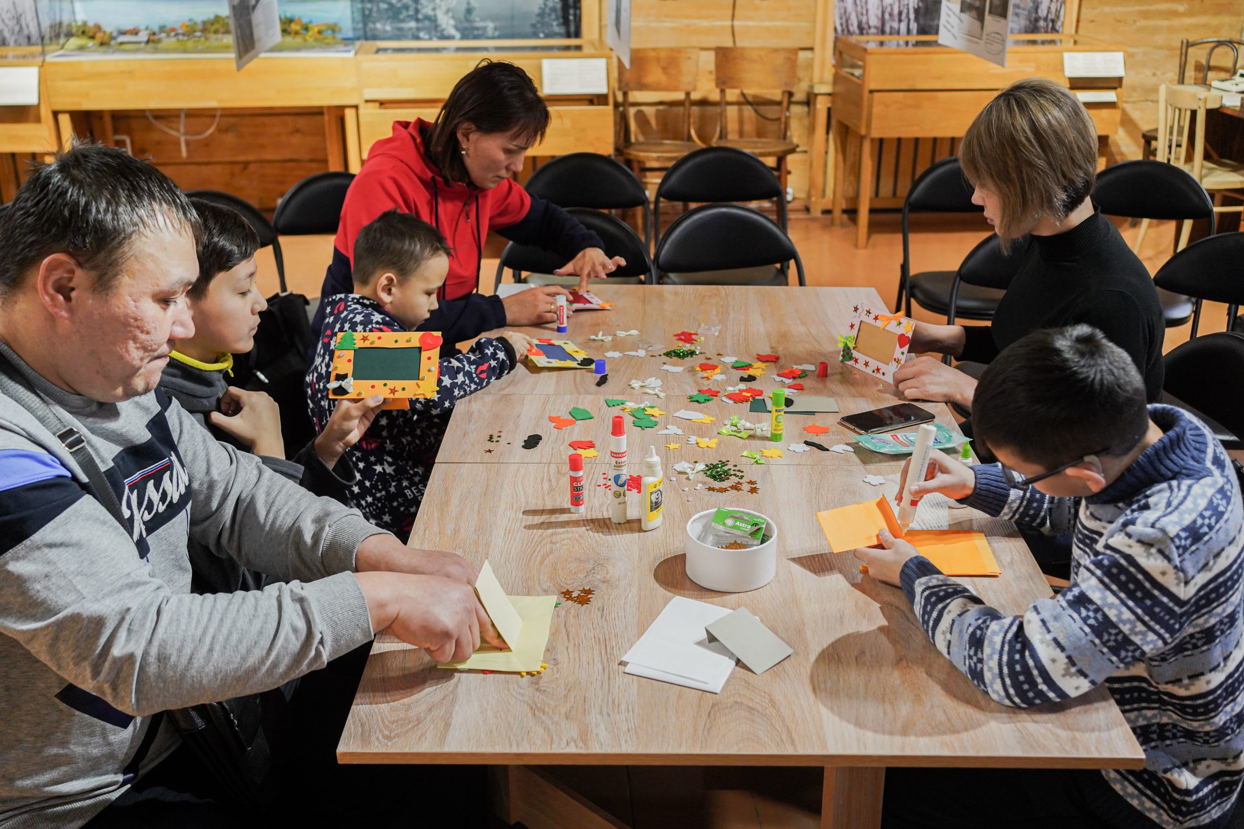 Итак, за столом оказалось трое взрослых и столько же детей. Перед ними были уже заранее подготовленные основные детали из цветной бумаги и картона, клей и различные украшения из бусинок, паеток, вырезанные фигуры из фетра. По сути, каждому предстояло сделать эксклюзивную фоторамку.