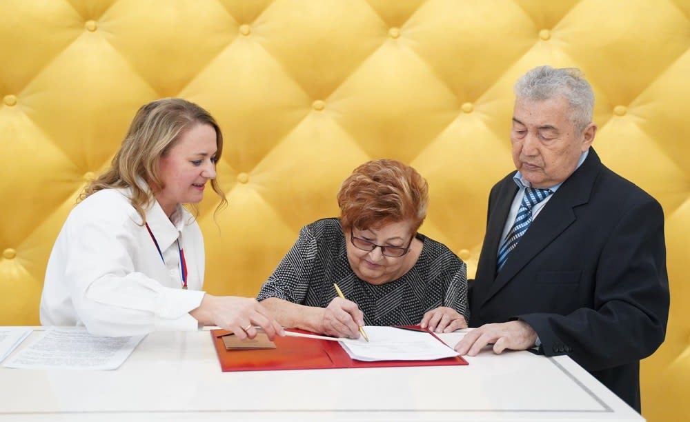 Сотрудники службы ЗАГС, обращаясь к семейной паре, подчеркнули, что юбиляры – гордость России, ее доблесть и слава! В честь этого прозвучал гимн Российской Федерации.