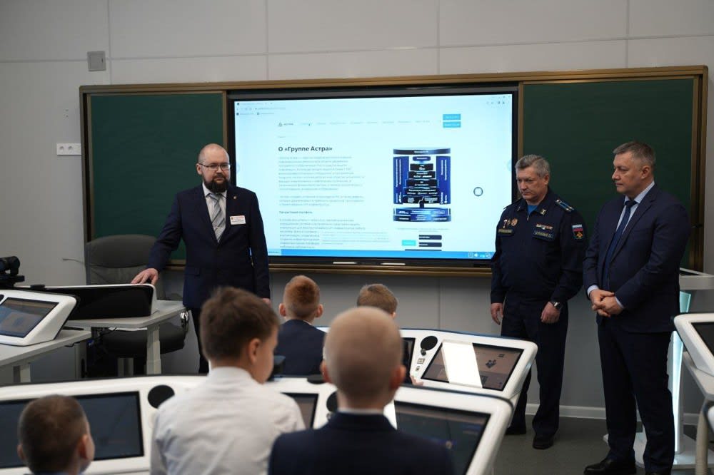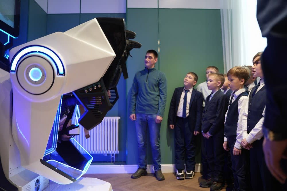 Ребятам показали кабинет лаборатории искусственного интеллекта (ИИ), который является примером эффективной экосистемы цифрового образования. Он оборудован цифровыми интерактивными партами. Всего здесь девять рабочих мест и стол учителя. Каждая парта представляет собой мультимониторную стойку со встроенной аудиосистемой и PTZ камерой для участия в онлайн занятиях и проведения открытых уроков. Каждый рабочий стол регулируется по высоте, в кабинете установлены две интерактивные панели, центральная совмещает роль классной маркерной доски. Все рабочие места и интерактивные панели объединены в систему, позволяющую простым жестом выводить на центральную панель изображение с любого из рабочих мест класса. Каждая цифровая интерактивная парта адаптирована под использование возможностей технологий ИИ, интегрировано в образовательные платформы: Цифровой голосовой ассистент «Алеша» и суворовской интеллектуальной обучающей средой «СУВИОС».