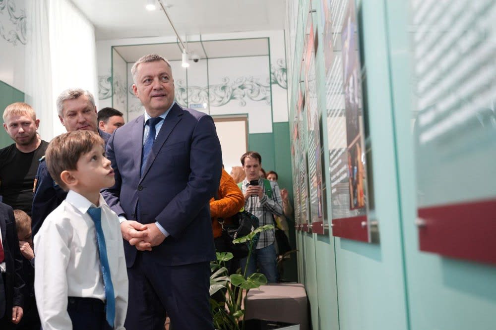 Школьникам показали стенд «Стена Героев» с портретами выдающихся людей, которыми гордится Иркутская область. Глава региона рассказал ребятам о главных заслугах военачальника Афанасия Белобородова, ученых и конструкторов Николая Камова, Михаила Миля, Михаила Янгеля, космонавтов Бориса Волынова, Александра Полещука, Анатолия Иванишина, Дмитрия Кондратьева.