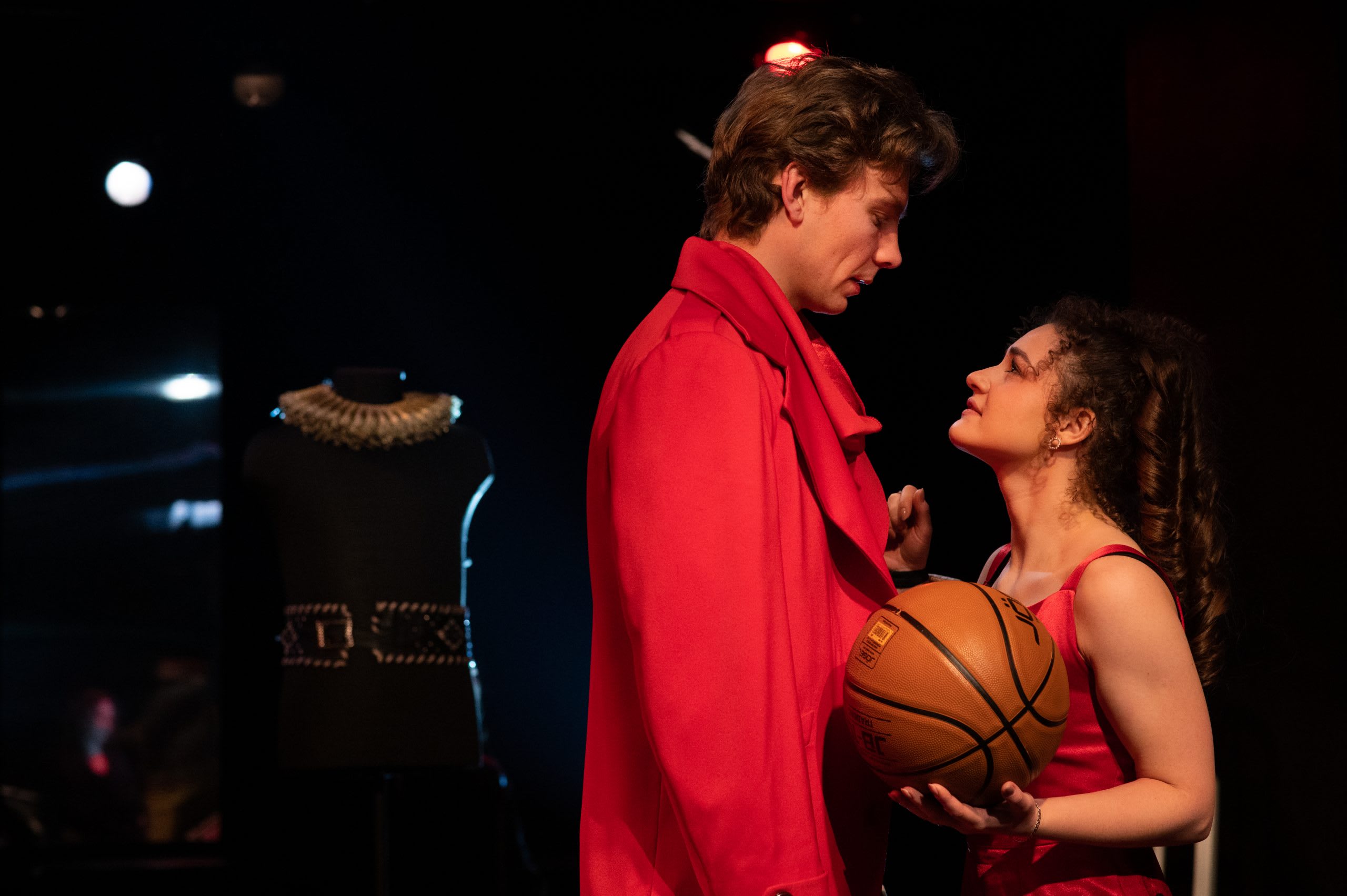 В руках у Марианны две мягкие игрушки-игольницы – лошадка и зайчик, которые сшила ее дочка. Кстати, после премьеры автор пьесы Ольга Богословская выложила под постом об этом событии в социальных сетях театра фото реальных лошадки и зайчика. Героиня спектакля начинает рассказывать участникам экскурсии о работе модельера-конструктора в театре, про костюмы, но в итоге говорит об истории своей семьи. И эти игольницы в пьесе превращаются в символы: женщины – зайчики, мужчины – лошадки.