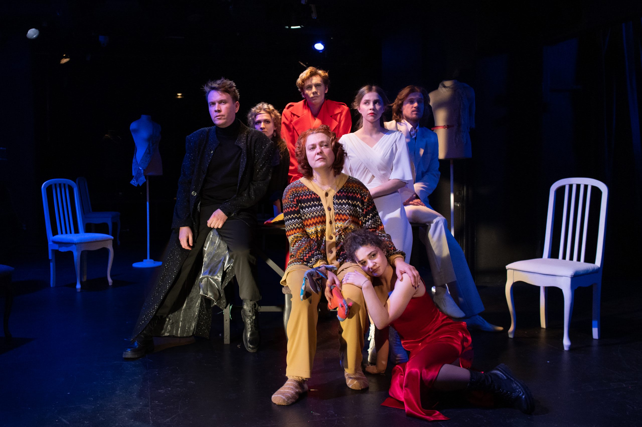 На сцене, кроме закроечного стола, – манекены и артисты, которые играют роли ее родни и ее в молодости. Кстати, именно Александр Баркар ввел в пьесу, которая задумывалась авторами как моноспектакль, этих героев, и спектакль от этого стал объемнее и интереснее.