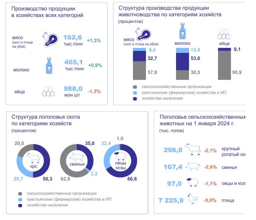 В хозяйствах населения произведено 53,6% молока, мяса – 32,7%, яиц – 9,1%. Вклад фермеров в областное производство мяса – 9,4%, молока – 15,9%.