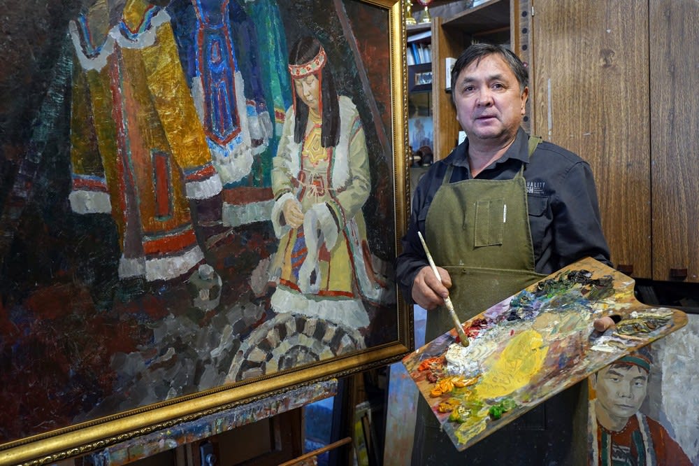 Нам удалось напроситься в гости к художнику за неделю до выставки, когда мастер еще не решил окончательно, какие картины показать зрителю, а какие оставить «дозревать» в мастерской. Над одним из полотен Писарев еще вовсю работал. На первый взгляд, сюжет прост: женщина в национальном эвенкийском наряде шьет праздничный наряд. Буквально сразу поразила не только и не столько фигура главного персонажа – ее мы узнали с ходу, а сама атмосфера. В кино и фотографии это называется эффект присутствия, когда, глядя на полотно, ты чувствуешь не запах еще свежей масляной краски, а в твою сторону тянет дымком таежного костра. Разглядывая с позволения мастера полотна, сначала думаешь, что сюжет многих довольно прост. Например, в чуме женщина сидит напротив мужчины, пьют чай, ведут беседу. И вроде бы нет особых смысловых аллегорий, и все понятно с психологией персонажей, но начинаешь чувствовать вдруг запах вяленой рыбы, даже слышать звон колокольчиков на оленях, которые толпятся у дымокуров за стенкой чума. Еще до конца не прописанный чайник над костром и схематичная связка рыбы магическим образом расширяет смысловое и пространственное восприятие бытового сюжета, который еще минуту назад казался обыкновенным. Вот эта магия, эффект присутствия, непостижимым образом заставляет зрителя подолгу оставаться у картины. Вопрос: на каком этапе художник начинает обладать подобной магией? Скорее всего, когда становится мастером.