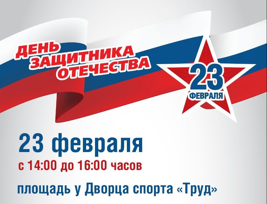 Праздник в честь Дня защитника Отечества в 14:00 на площади у Дворца спорта «Труд». В программе запланирован патриотический концерт с участием артистов. На площади установят специальный спасательный модуль, в котором представят образцы оружия. Гости мероприятия смогут поучаствовать в мастер-классе по оказанию первой медицинской помощи. Для самых активных организуют сдачу норм ГТО и спортивные интерактивы. На празднике будет работать полевая кухня. Все желающие смогут угоститься кашей и сладким чаем.