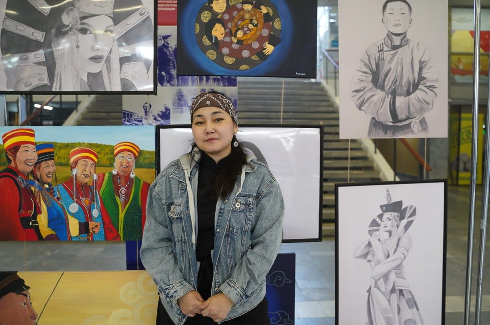 – Вот здесь я изобразила, как бабушки поют песни на природе. Это участницы нашего ансамбля «Анга», выступление которых мы сегодня услышим. Есть акварельная серия, черно-белые работы. Многое делала вместе с сестрой-двойняшкой. Она фотографирует, я потом рисую, вот, например, бабушка с трубкой была нарисована по фотографии, – рассказывает Марина Вахрушкина, художница из Боханского района.