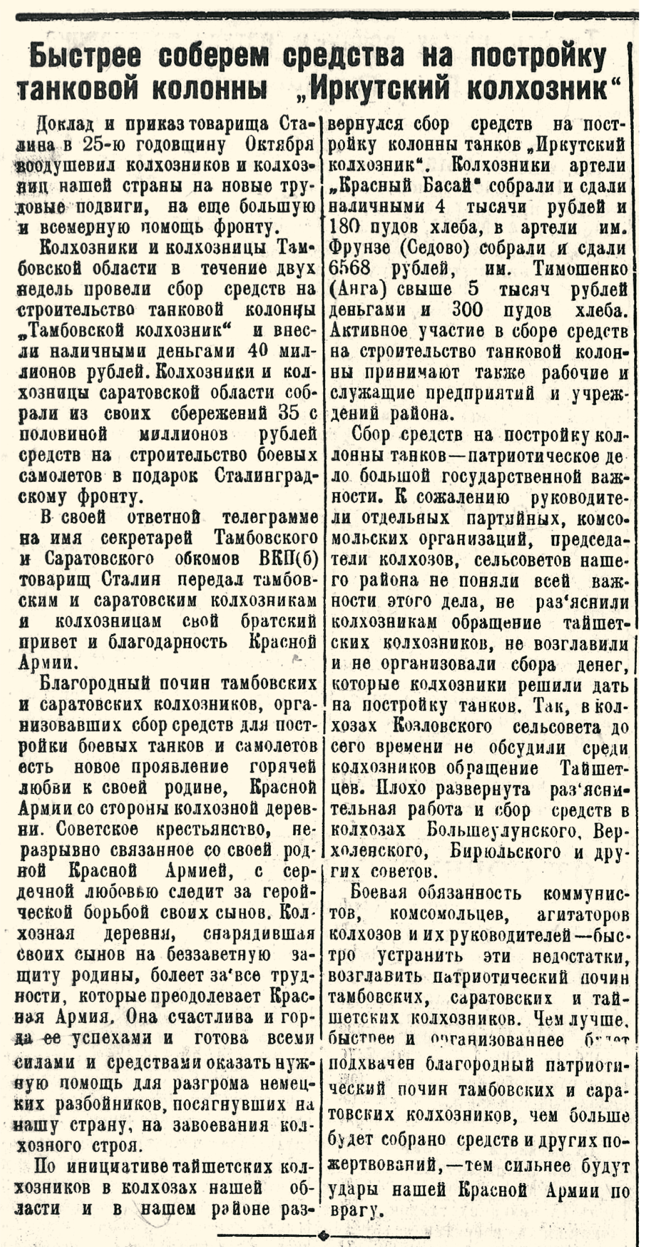 Труженики тыла регулярно отчисляли однодневный заработок в фонд обороны. Всего на добровольные пожертвования населения было построено более 2,5 тыс. боевых самолетов, несколько тысяч танков. Не остались в стороне и жители Приангарья.
