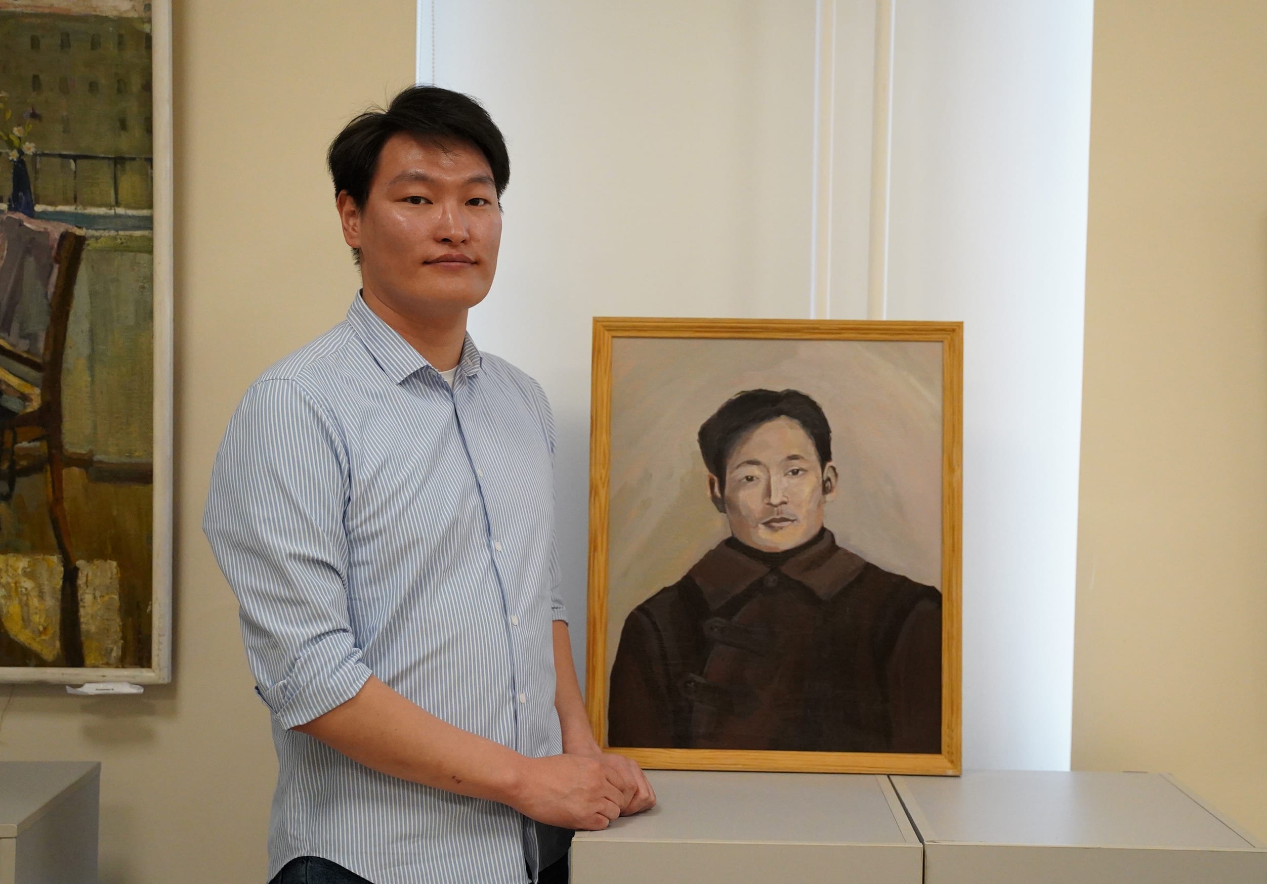 – Когда Андрей Хамнуевич шел на войну, он оставил жену и детей. С фронта не вернулся… Пал смертью храбрых, защищая берега Волги в 1942 году. Меня очень тронуло в его биографии, что, несмотря на свою юность, Андрей был очень мужественным и храбрым. Он отдал жизнь за мирное небо, за то, что мы сейчас с вами сидим и спокойно разговариваем… В портрете я хотел передать его нежность, тонкость, он ведь был очень юным, но при этом отразить силу его духа.