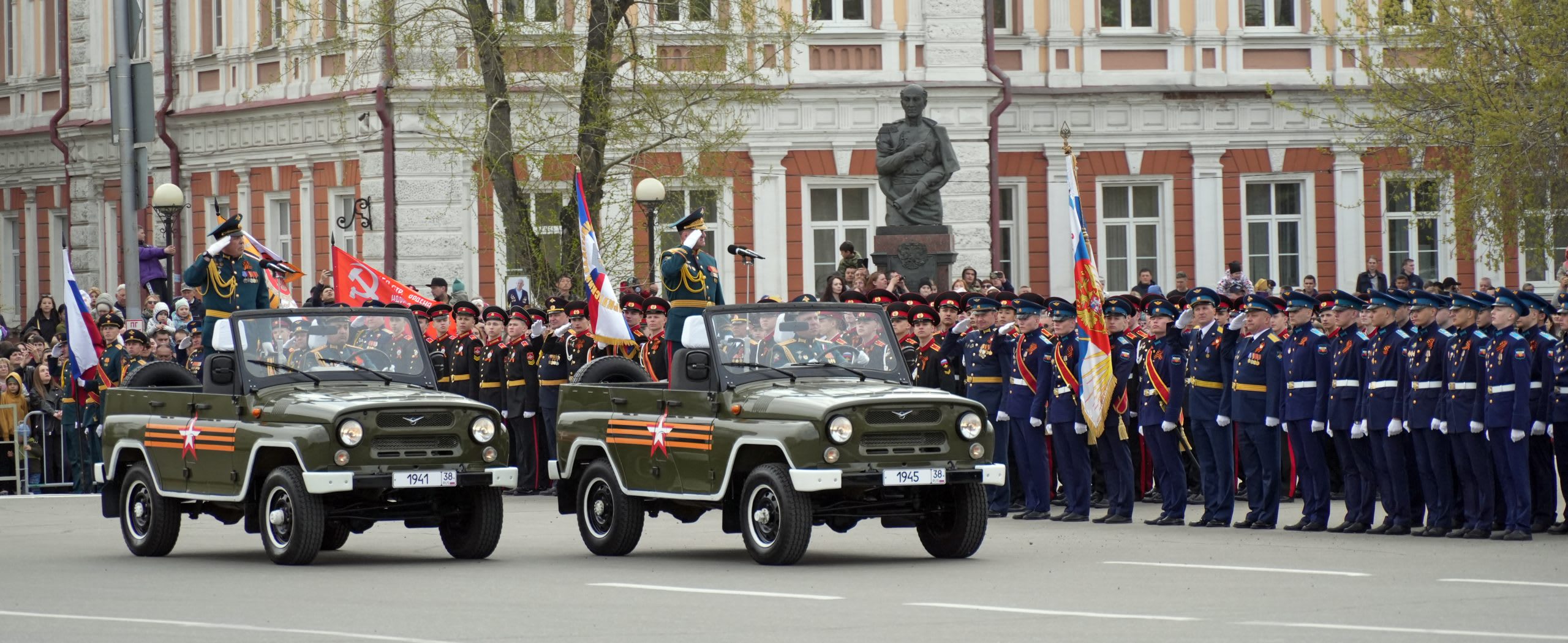 Под военные марши проходили парадные расчеты силовых структур Иркутского гарнизона, юнармейцев, кадетов. Впервые торжественным строем маршировали на параде воспитанники Иркутского Суворовского училища.