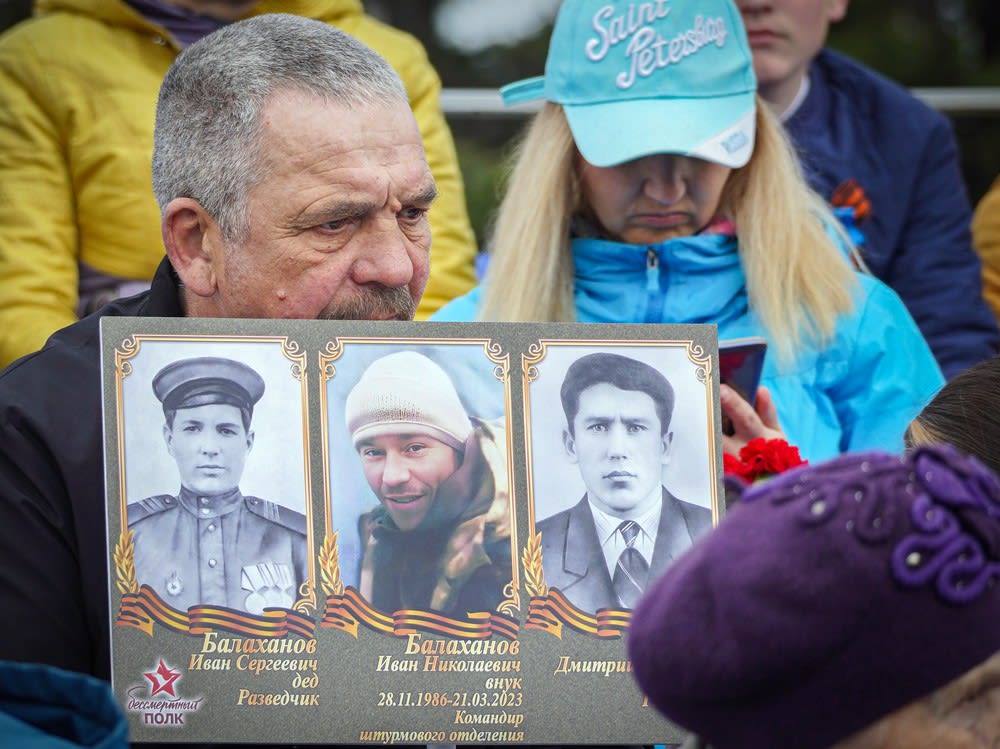 В этом году в России отменили «Бессмертный полк», но горожане, шедшие на парад, брали с собой портреты родных фронтовиков. «Степан Беспалов, погиб 8 мая 1945 года в Берлине», читалось на одном из штандартов.