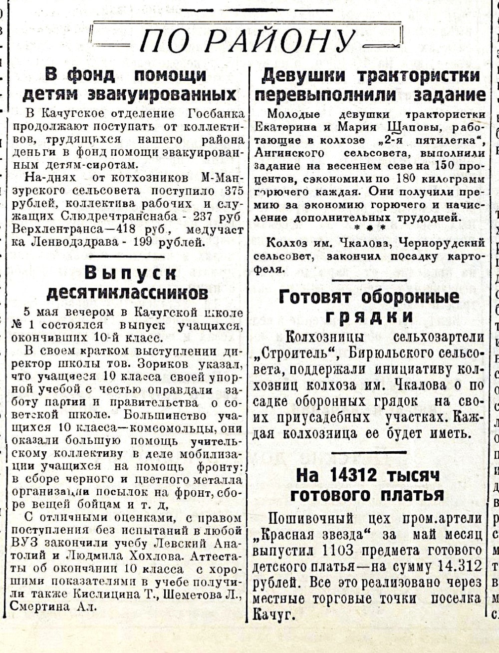 Листая подшивку районной газеты «Верхне-ленская правда» за 1942 год, невольно ловишь себя на мысли, что известный лозунг «Все для фронта, все для Победы!» для простых жителей сибирской глубинки был призывом к действию. Летом 1942 года в Качугском районе родилась инициатива под названием «Оборонные грядки». Суть идеи, подхваченной земляками, была проста: энтузиасты предлагали распахать землю на своих участках под дополнительные грядки, а выращенный на них урожай отправить на фронт. Движение активно подхватили школьники. Пока не удалось отыскать конкретные цифры – сколько удалось вырастить таким образом овощей, но сам факт, с каким энтузиазмом жители сел подхватили данную инициативу, говорит о многом.