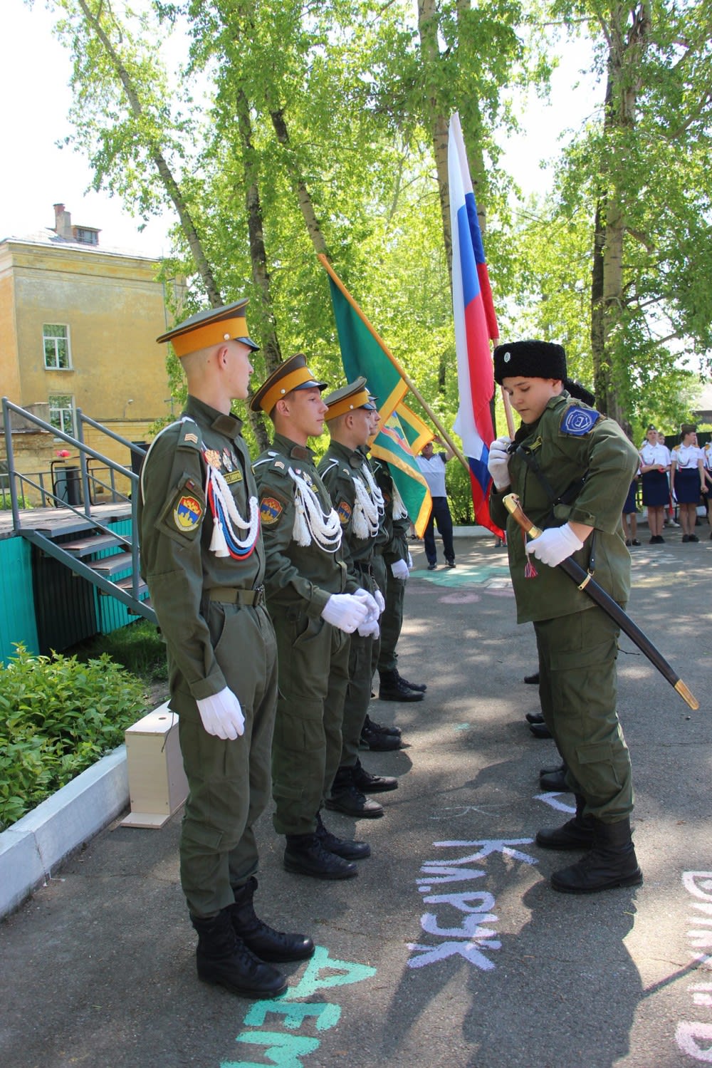 Последние приготовления к линейке – кадеты поправляют аксельбанты цвета триколор, юные казачки придирчиво рассматривают себя в зеркале – в порядке ли форма? В этот день все внимание им – выпускникам. Семейные фото на фоне баннера «Выпуск-2024» и по школьной традиции – рисунки на асфальте на память: герб Иркутского войскового казачьего общества в окружении имен кадетов. Все говорит о том, что выпускаются казаки и казачки.