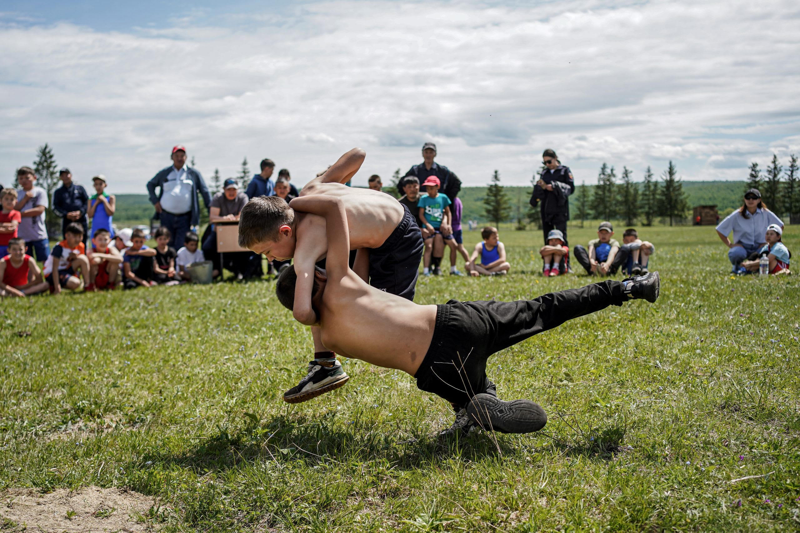 По соседству разминались юные борцы. Этот вид спорта в Баяндаевском районе что-то вроде религии. Даже в таких небольших деревнях, как Шутхалун, Кайзеран, Нагалык, дети с увлечением занимаются борьбой, здесь проводятся районные соревнования для отбора на областные.