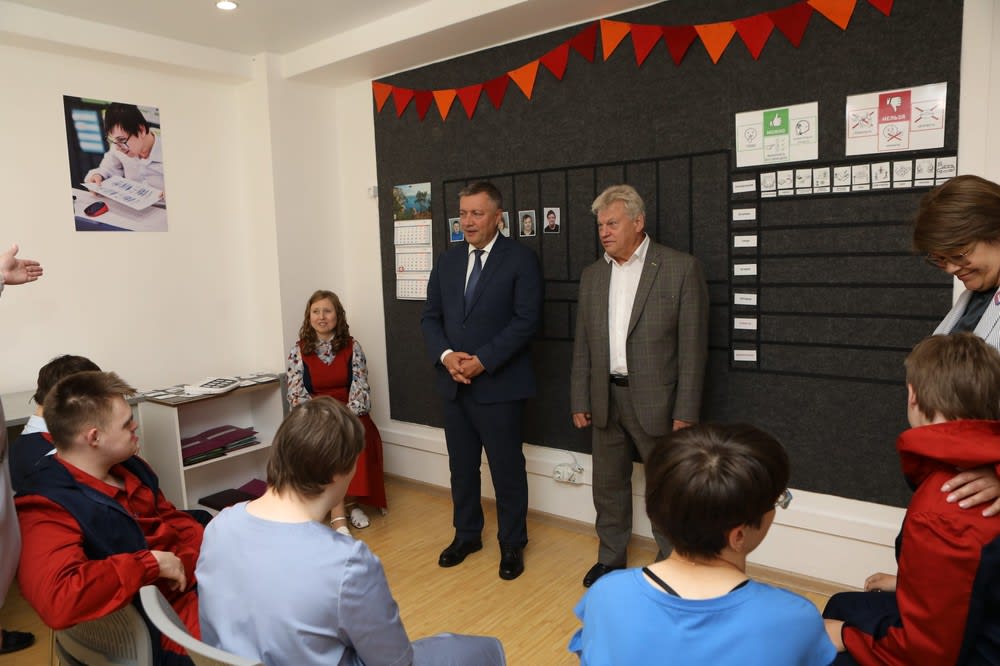 Губернатор ознакомился с деятельностью отделения, где будут заниматься ребята с проблемами ментального развития. Здесь оборудованы полиграфическая, швейная, творческая мастерские, театральная студия, кухня для занятий домоводством, комната отдыха.
