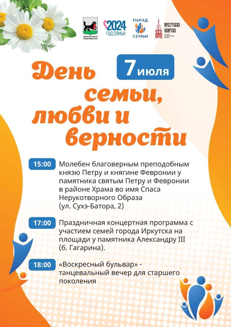 В 17:00 на площади у памятника Александру III проведут торжественную церемонию регистрации брака для трех пар. Запланирован праздничный концерт, участие в котором примут шесть иркутских семей. Они выступят на сцене с творческими номерами, расскажут свои истории, а некоторые из них представят мастер-классы по макраме и плетению из эколозы. Завершит программу общий танец супружеских пар под музыку в исполнении городского эстрадно-духового оркестра. Присоединиться к нему сможет любой желающий.