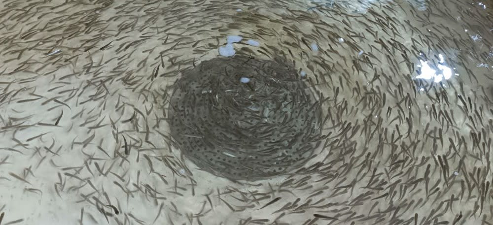 Работники рыбоводного завода сначала зашли в пруд с неводом, выловили партию рыбок. Ее отправили на взвешивание. Хариузята хорошо подросли.