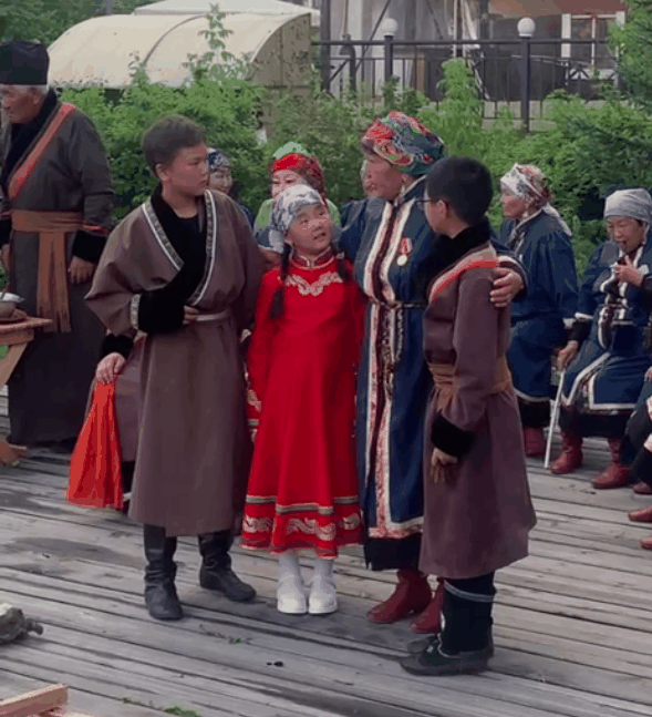 Сам обряд начался с обрядовой песни, во время которой Петр очищал местность проходом около зрителей. Потом выходит бабушка и зовет внуков, далее происходит общение между семейством, скотоводами, охотниками и шаманом.