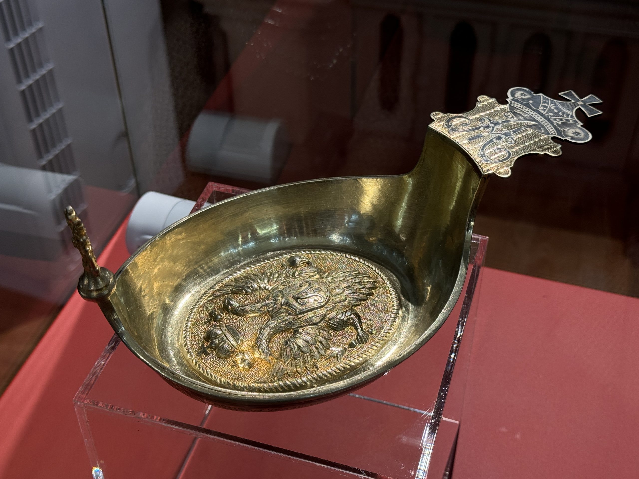 – В витрине представлены три жалованных серебряных ковша с позолотой, – отметил Григорий Зубенко. – Эти уникальные предметы – высшая награда казачества именно в XVIII веке за верную службу. Их, кстати, перестали выдавать при Александре I. На каждом есть государственная символика, вензель или портрет правителя, надпись – кому он дарован и за что. На выставке также есть одна жалованная сабля времен Екатерины II. Это награда пониже, давалась, когда казаки отправляли посольства с дарами в Москву. Есть также именные медали, которые носились на груди, на большой цепочке, как знак отличия. Все они были атрибутами статуса.