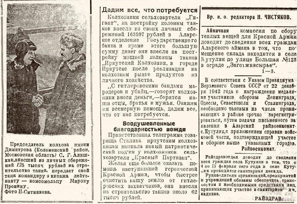 Сегодня читаем газету «Аларский колхозник» за февраль 1943 года.
