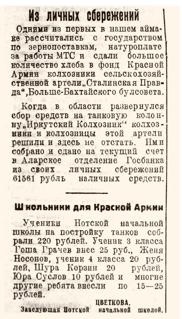 Просматривая подшивки районных газет, которые выходили в период Великой Отечественной войны, поражаешься трудовому героизму сибиряков. Среди героев публикаций преимущественно женщины либо школьники. Те и другие трудились за себя, за братьев и за отцов, ушедших на фронт.