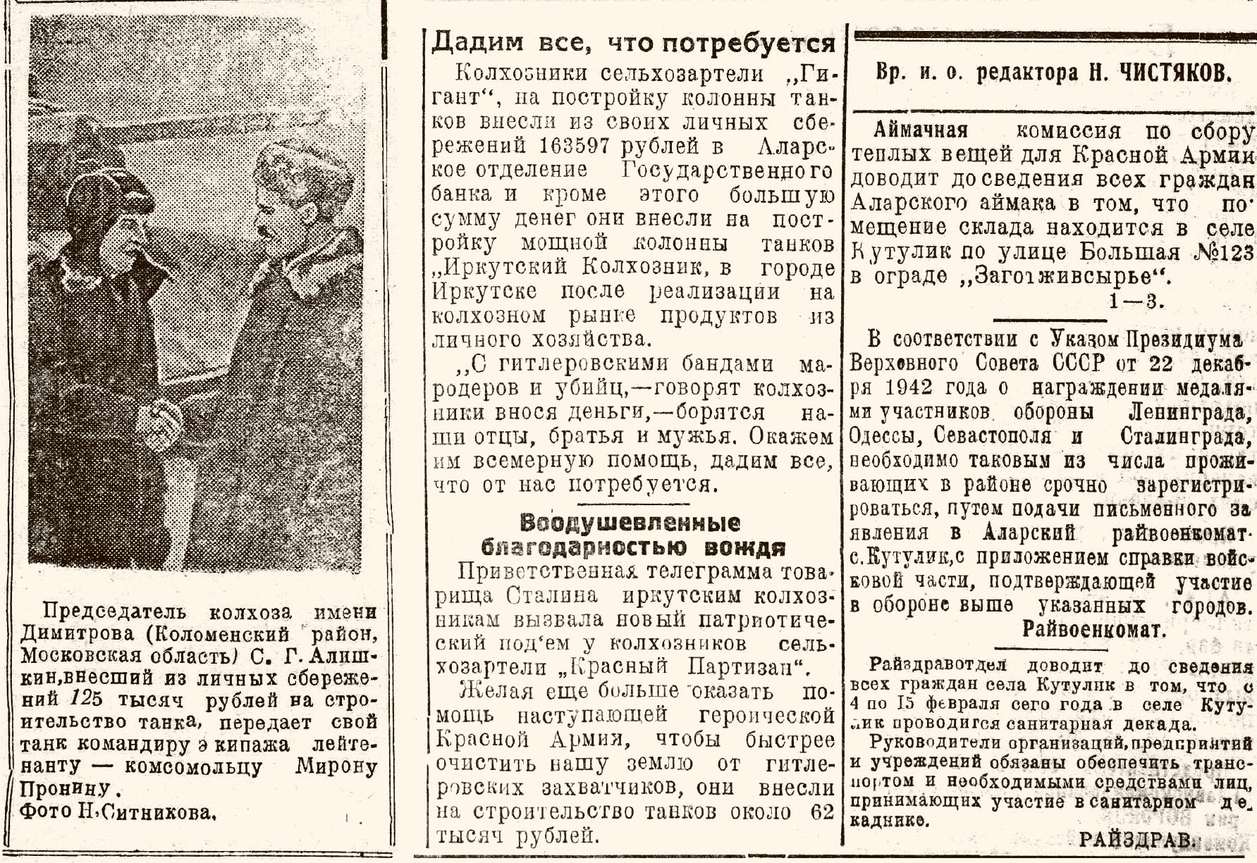 Сегодня читаем газету «Аларский колхозник» за февраль 1943 года.