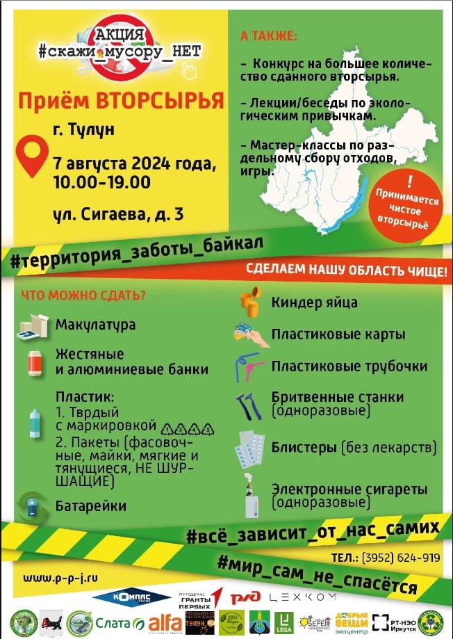 7 августа перенять эстафету акции готовится город Тулун, место проведения и список принимаемого вторсырья можно найти в афише.