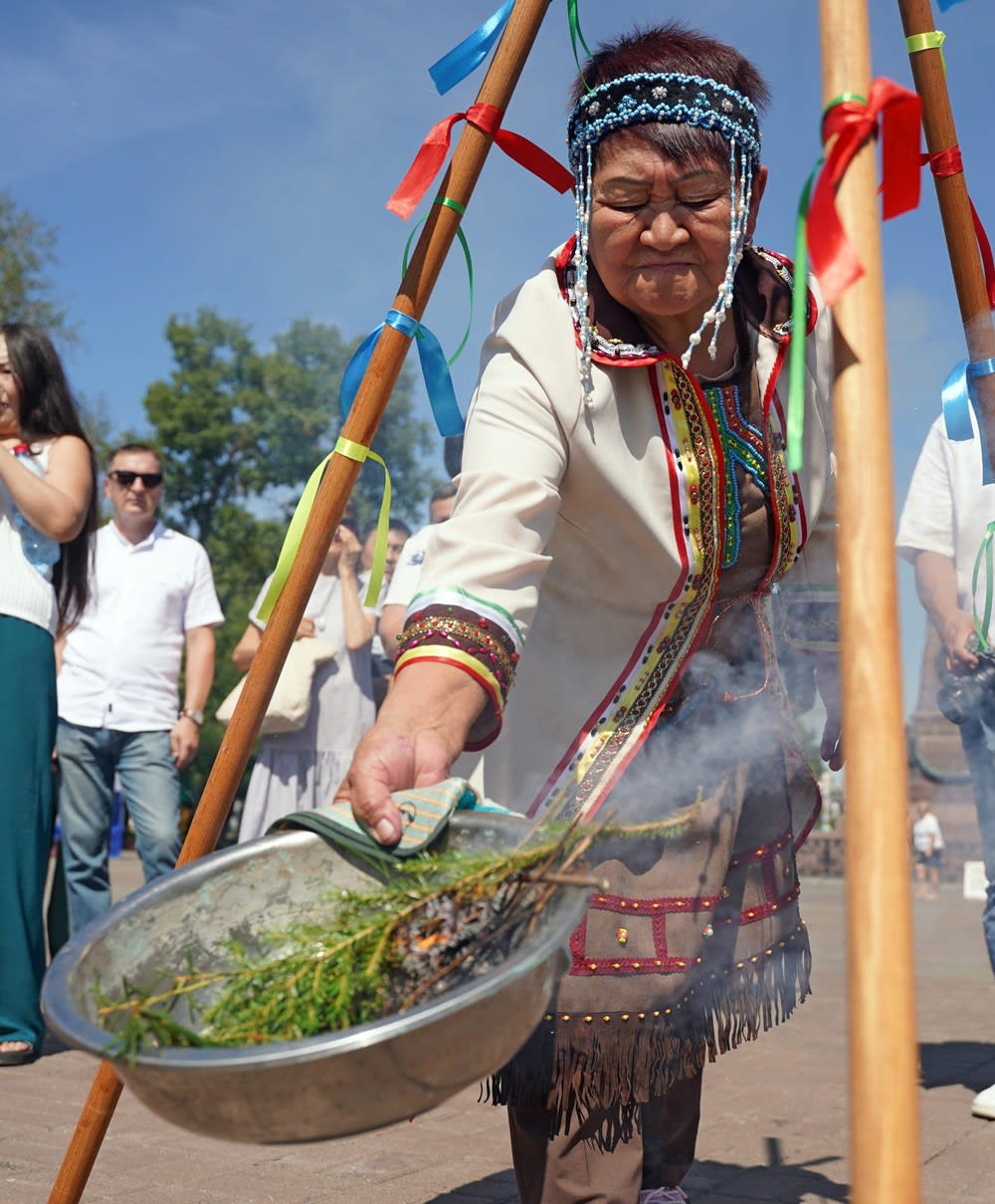 По древней традиции любое мероприятие эвенки и тофы начинают с обряда очищения, гости проходят через небесные врата – «чичипкан», повязывают разноцветные ленты, загадывая желания. На набережной Ангары древний обряд провела одна из старейших представительниц Катангского района Ия Ивановна Цуркан.