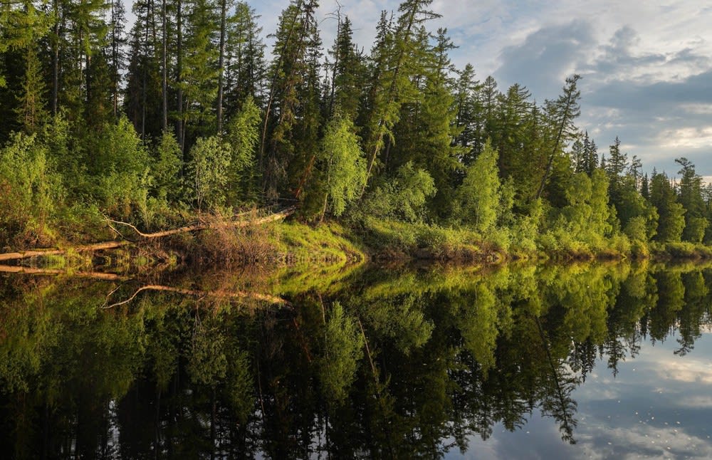 Погода благоволила нашей экспедиции, на реке длительное время наблюдался полнейший штиль. Облака отражались в воде и временами казалось, что лодка плывет по небу. Основной плюс путешествия по воде – отсутствие комаров и гнуса. Начинаешь понимать это, едва лодка утыкается носом в берег. С этого момента паразиты кусают просто немилосердно.