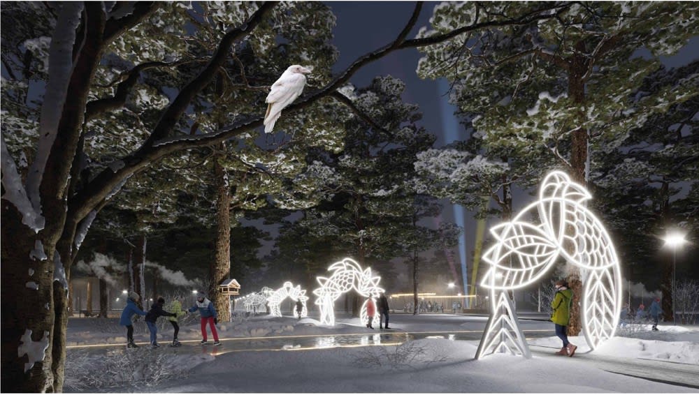 Каждая зона получит свое название: детская площадка – «Под крылом белого ворона», спокойная – «Сон белого ворона», пешеходные зоны, тропы – «След белого ворона» и «Свет белого ворона», аллея – «Клюв белого ворона» и так далее. Если посмотреть на проект с высоты птичьего полета, то можно увидеть, что в его границы вписан ворон, который держит в клюве сыр. На «сырной площади» планируется разместить торговую зону, где будут реализовываться сыры и продукция от местных производителей.