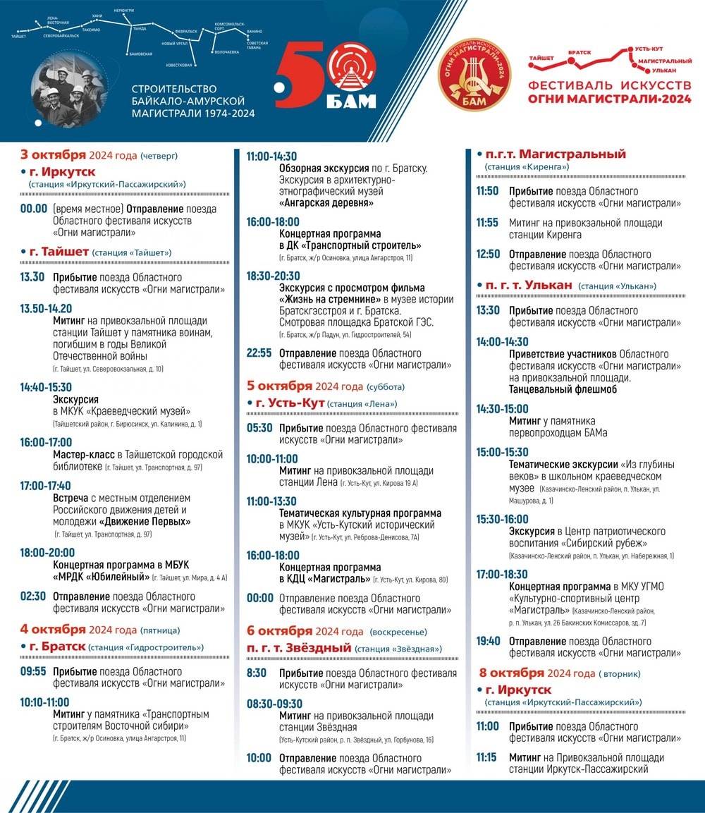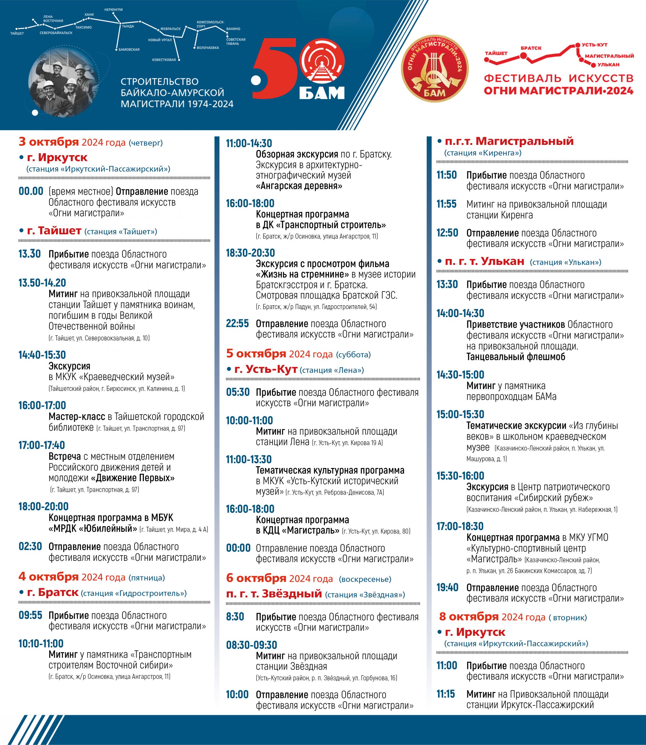 Праздничный поезд фестиваля искусств «Огни магистрали» (16+) пройдет по маршруту строительства БАМ с 3 по 8 октября. Пассажирами станут около 90 человек. Мероприятие приурочено к пятидесятилетию начала строительства Байкало-Амурской магистрали. Об этом 30 сентября 2024 года сообщила пресс-служба Иркутского областного дома народного творчества.