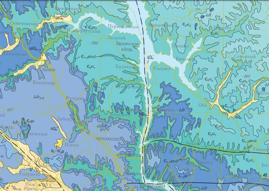 На геологической карте юга Братского водохранилища часть территории отмечена голубым цветом. Это литвинцевская и ангарская свиты нижнего кембрия, которые подвержены карсту – т.е. растворению подземными и поверхностными водами горных пород, в которых образуются пустоты.