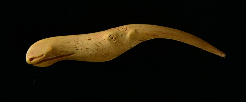 Три экспоната из очень известного ранненеолитического могильника Шаманка II: фигурка головы лося; ложка, выполненная из рога оленя, тоже с навершием в виде головы лося и очень редкий, уникальный, оригинальный предмет — это фигурка нерпы, это стержень и навершие у нее голова нерпы.