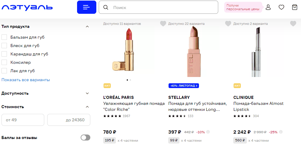 - Крупные косметические сети. Магазины вроде ЛЭТУАЛЬ предлагают широкий выбор помад от мировых брендов. Вы можете быть уверены в качестве продукции и к тому же воспользоваться частыми акциями и скидками.