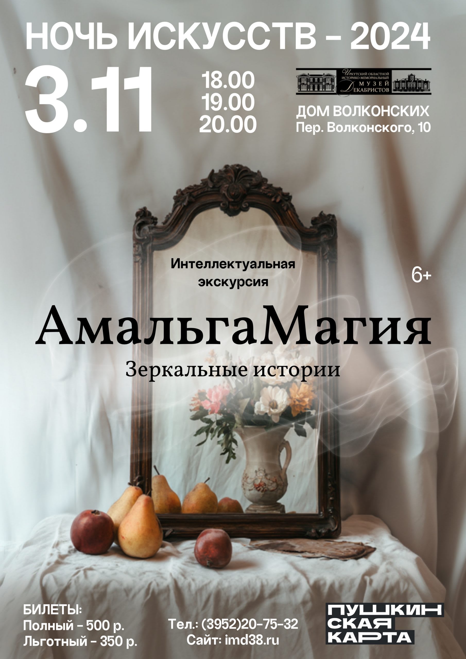 Иркутский музей декабристов приглашает на интерактивную программу «АМАЛЬГАМАГИЯ». В ходе интерактивного путешествия по княжескому дому можно будет узнать много «зеркальных» историй из мифов и легенд, сказок и литературных произведений всемирно известных авторов. Гости смогут показать свои знания об этом магическом предмете, принять участие в гадании и поучиться театральному мастерству на мастер-классе от профессионального актера. Сотрудники в исторических костюмах представят удивительные старинные зеркала из коллекции Иркутского музея декабристов.