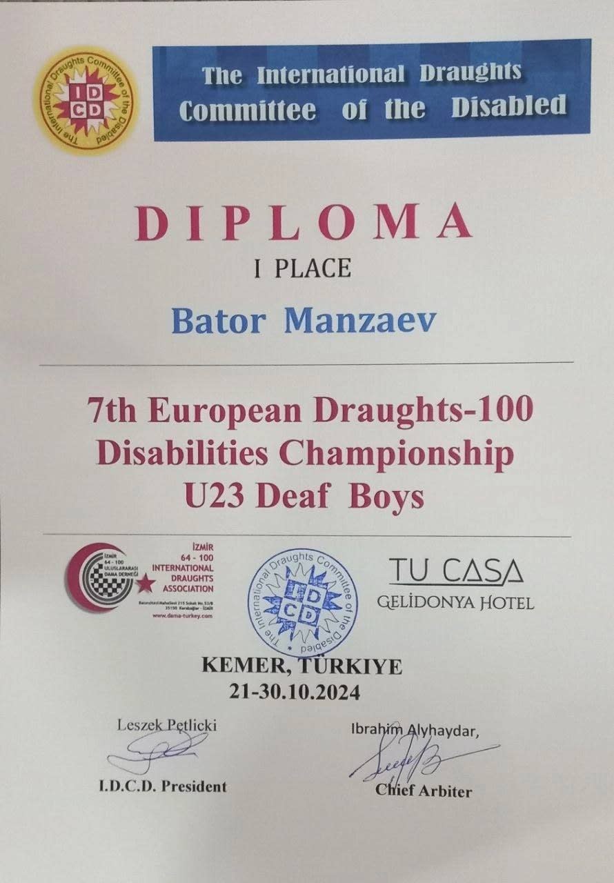 До Турции парень участвовал в Первенстве России по шашкам среди глухих и слабослышащих, который проходил в городе Зеленограде Московской области. Десятилетний Батор занял пятое место в первой программе, четвертое место во второй, выполнил норматив первого взрослого разряда.