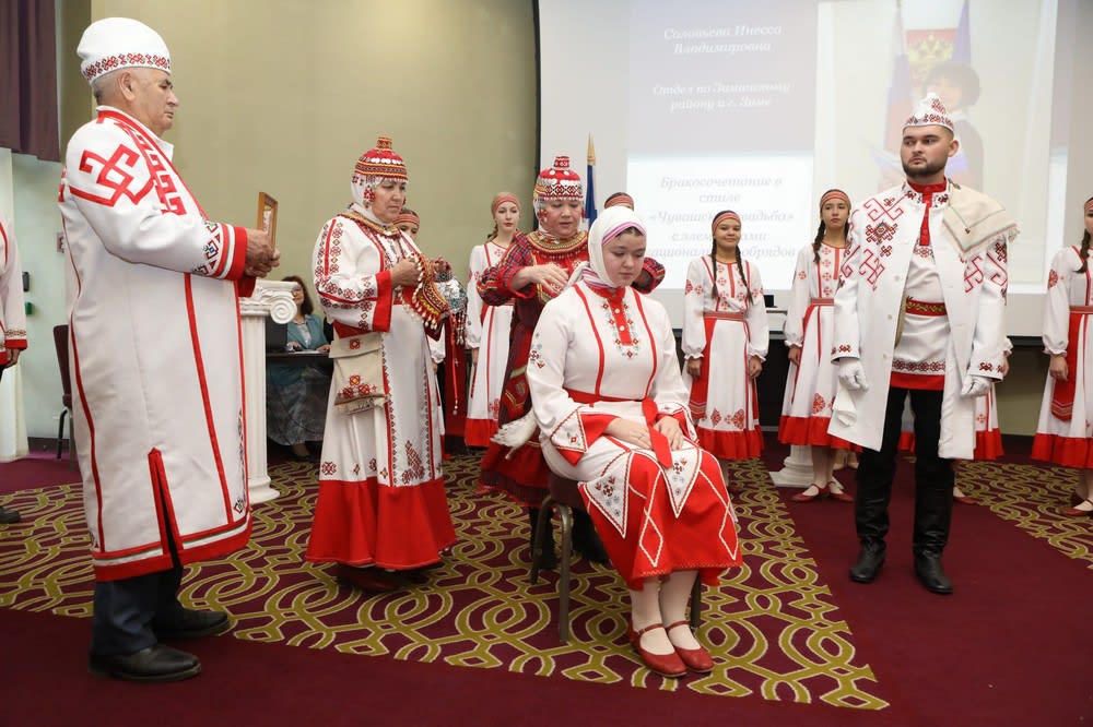 Одним из самых ярких стало выступление Инессы Соловьевой из отдела по Зиминскому району и Зиме службы ЗАГС. Она представила свадебную церемонию в традициях чувашского народа. В настоящем театрализованном действии участвовали 18 человек – это жених и невеста, их родители, а также гости.