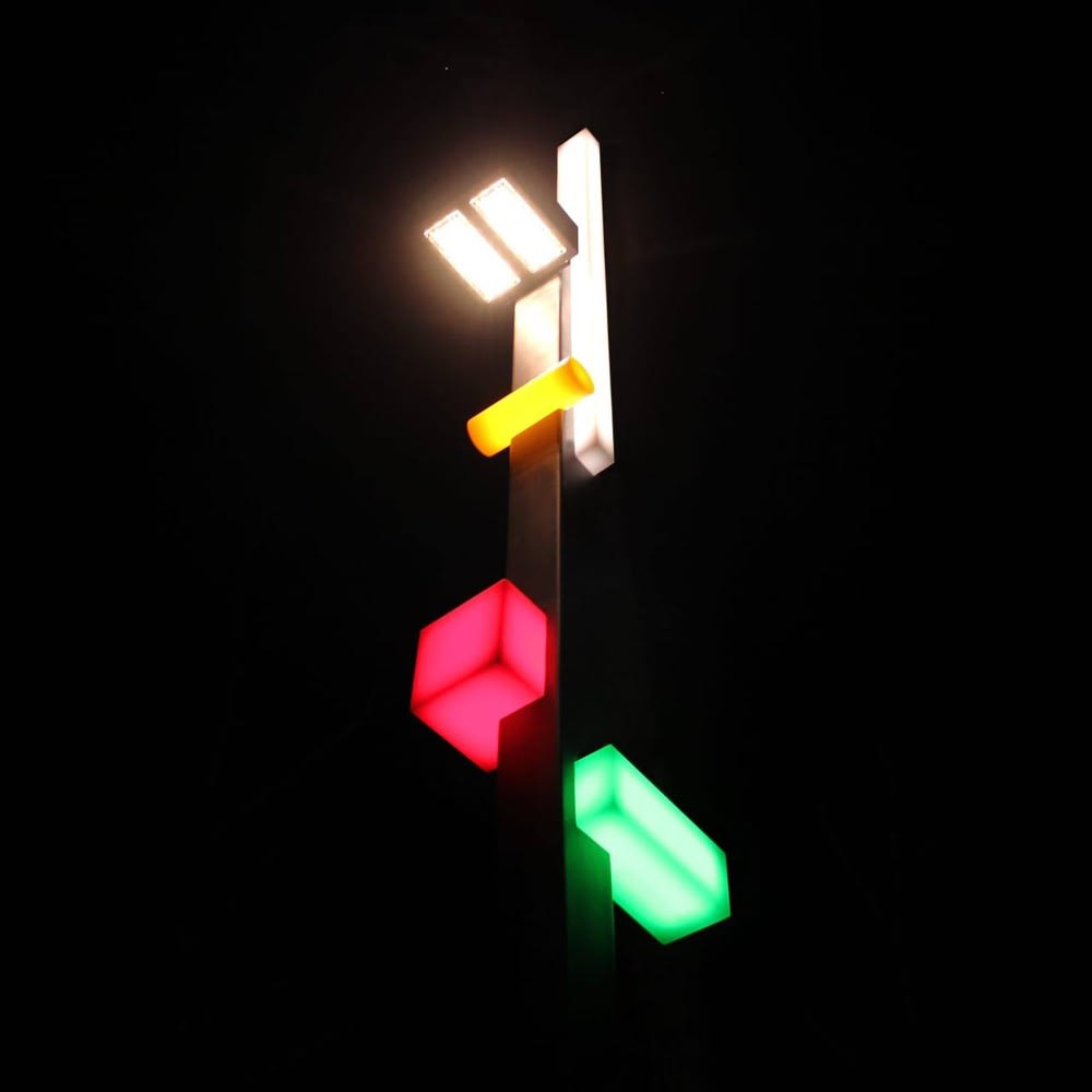 Автор светильников, архитектор Сергей Демков. Опоры изготовлены из металлического профиля с основным источником света и дополнены элементами из цветного акрила со встроенными светодиодами.