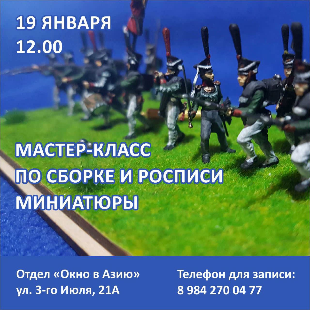 Краеведческий музей приглашает на мастер-класс по росписи миниатюры. Он посвящен объявленному в России Году Защитника Отечества и приурочен ко Дню Победы в Отечественной войне 1812 года (отмечается 7 января). Участники прослушают небольшую лекцию о ходе войны и принимавших в ней участие иркутских полках, увидят артефакты, привезенные с Бородинского поля (горсть земли и свинцовую пулю). Затем они распишут фигурку русского гренадера в масштабе 1/72 (2,5 см). Расписанное изделие участник заберет с собой.