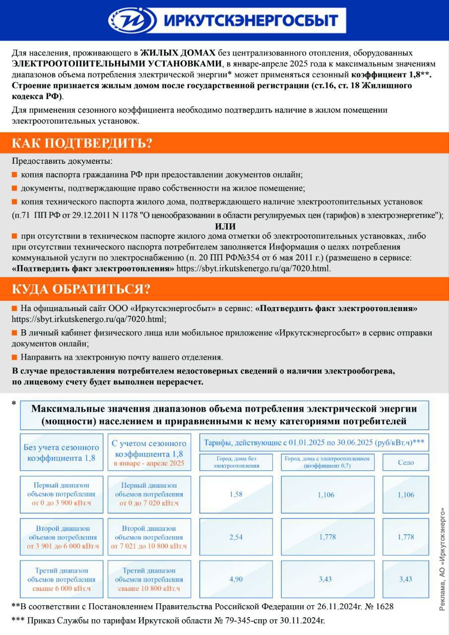 Иркутская область – один из немногих регионов страны, где при расчетах платы за потребленный ресурс применяют повышающий коэффициент 1,8 для дифференцированных тарифов на электроэнергию. Это существенно снижает нагрузку на семейный бюджет. Чтобы владельцы частных домов могли воспользоваться таким преимуществом, им необходимо предоставить документы, которые способны подтвердить использование электроотопления. По последним данным жители региона направили энергетикам 65,4 тыс. пакетов документов.