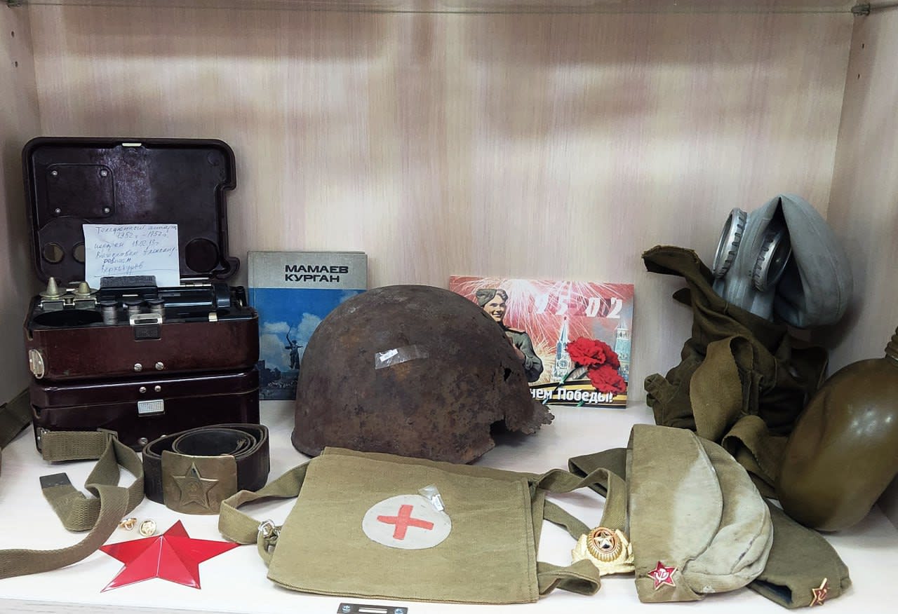 Другой военный стенд посвящен спецоперации. Здесь хранят российский флаг, который спас жизнь бойцов. Стяг с пожеланиями военнослужащих вернул в школу участник СВО Игорь Крыжевой с позывным «Леший». Тут же размещены его подарки: индивидуальная аптечка, артиллерийский компас, шеврон и саперная лопата украинского снайпера.