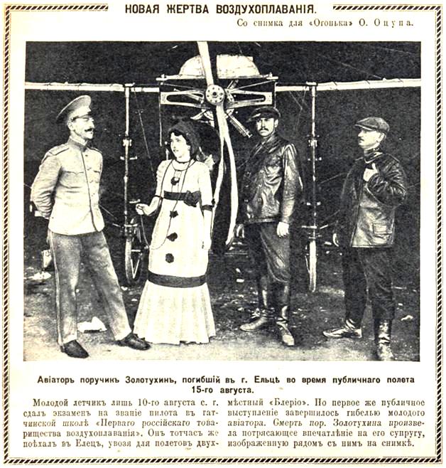 «Телеграф принес печальное известие о гибели в городе Ельце русского авиатора штабс-капитана в запасе Мстислава Максимовича Золотухина. Авиатор во время спуска на «Блерио» с незначительной высоты вылетел из аппарата, который всей тяжестью придавил его. М.М. Золотухин, промучившись несколько часов от тяжких повреждений всего тела, скончался.