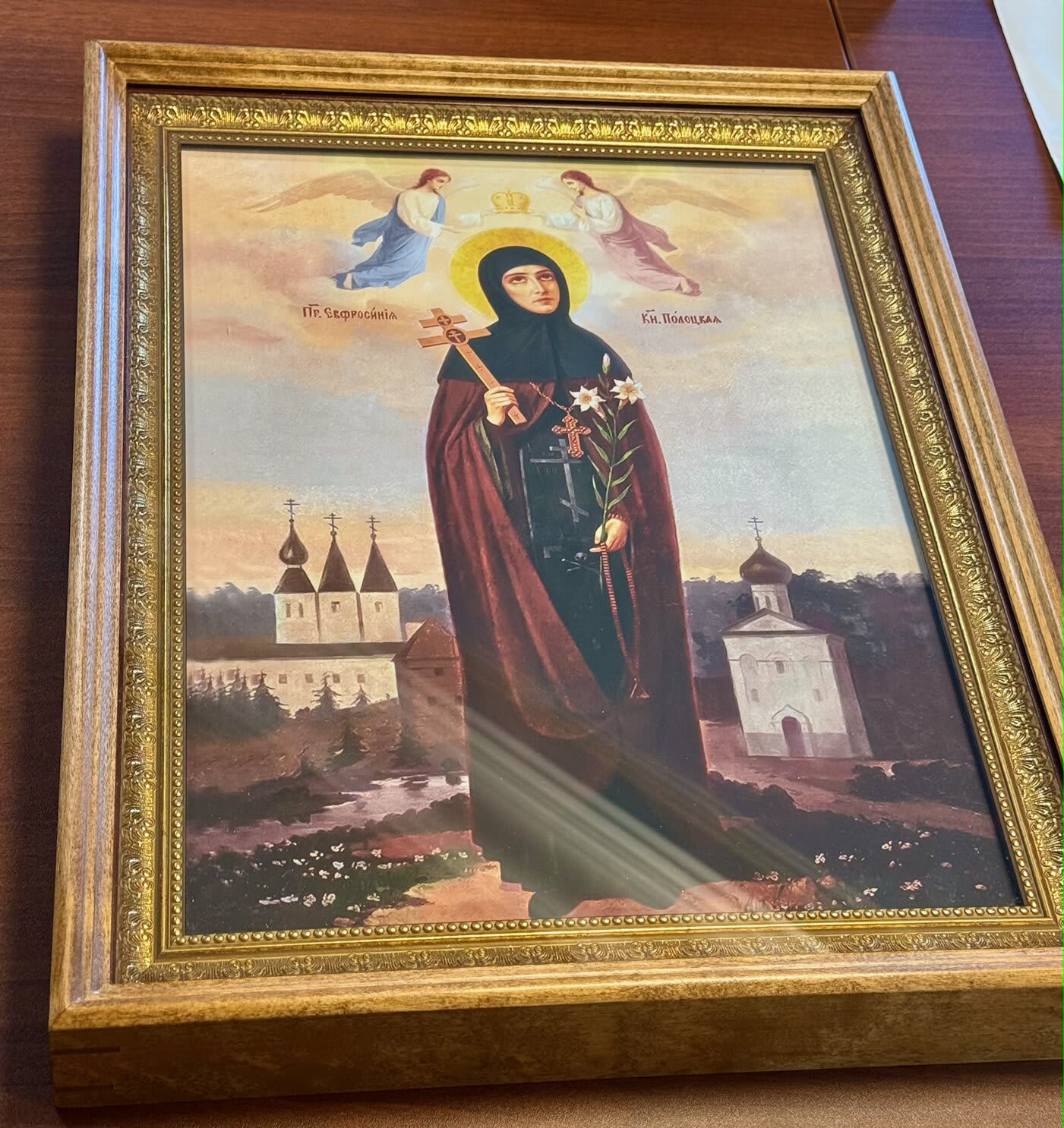 Образ святой княгини Ефросинии Полоцкой считается одним из самых значимых для белорусов. Известно, что в юном возрасте она решила отказаться от мирской жизни и полностью посвятить себя монашеству. Преподобная активно выступала против ведения войн, занималась переписыванием и переводом церковных книг. На скопленные средства построила две церкви в Полоцке, которые длительное время являлись известными центрами просвещения. Митрополит Максимилиан поблагодарил за дары и выразил уверенность в плодотворном сотрудничестве между Иркутской митрополией и Императорским православным палестинским обществом.