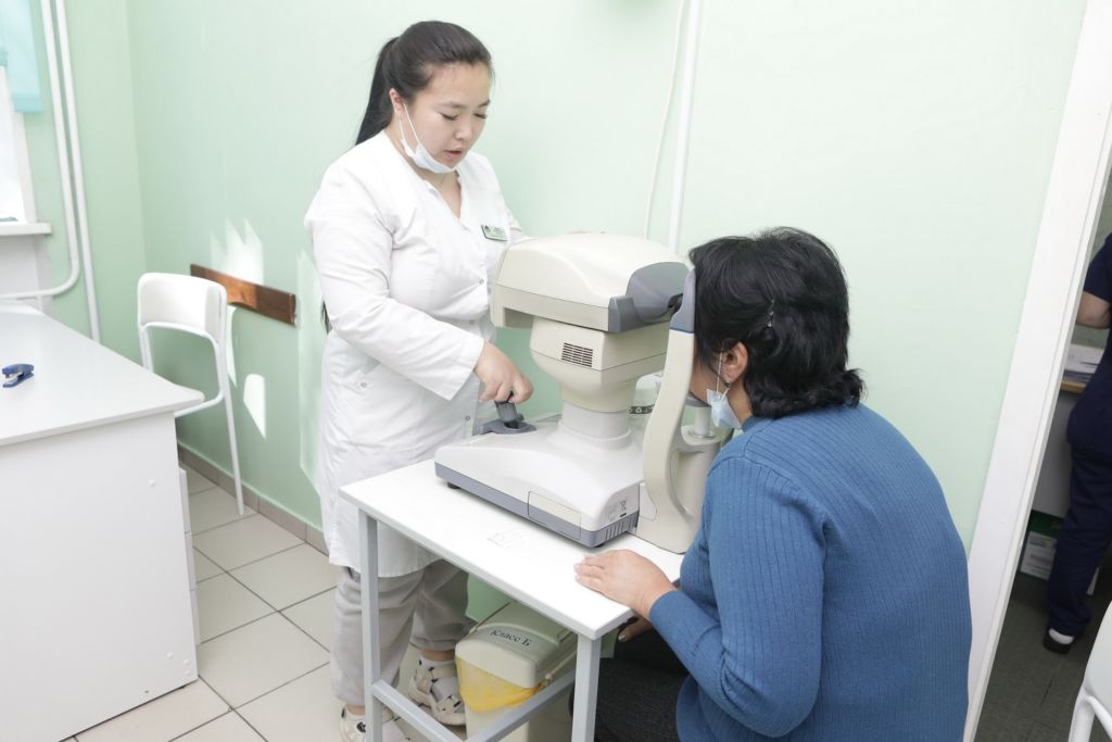 В кабинете по соседству медсестра Мария Шаргаева измеряет пациентке внутриглазное давление. Это показатель, по которому офтальмолог может оценить состояние здоровья глаза. Его изменения – признак патологического процесса, из-за которого затем ухудшается зрение.