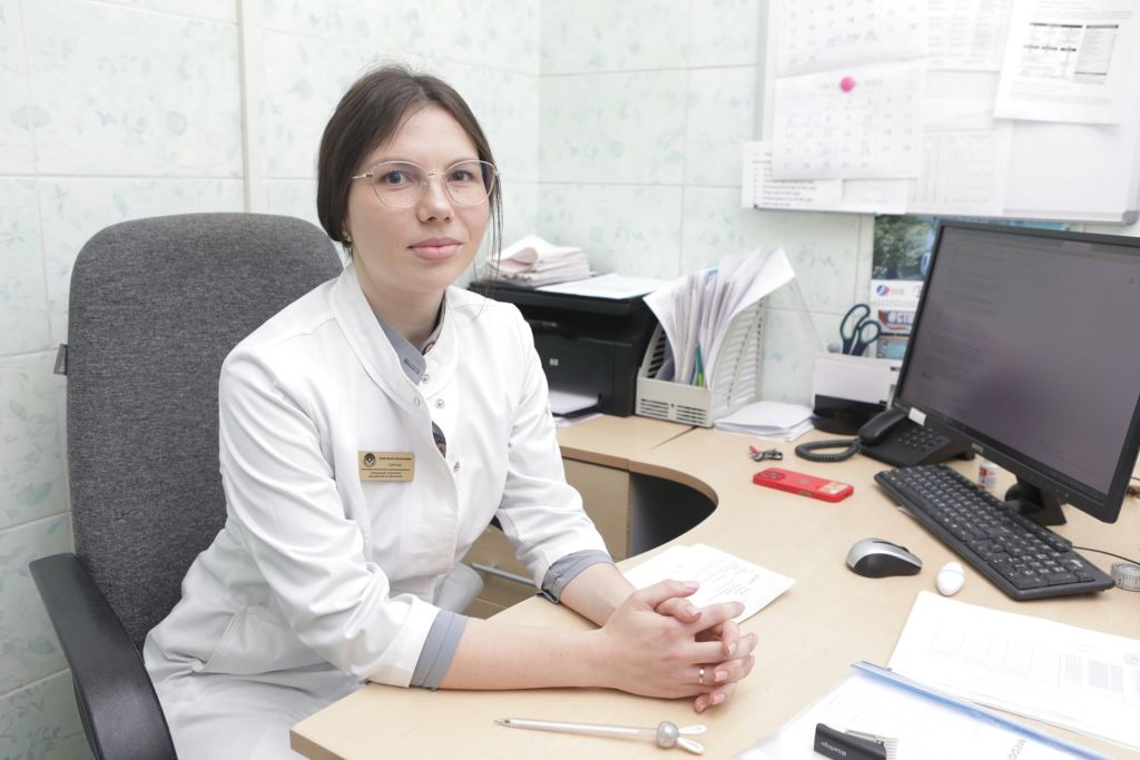 Пока беседуем, молодой специалист, терапевт Елизавета Банщикова проводит очередной диспансерный осмотр.