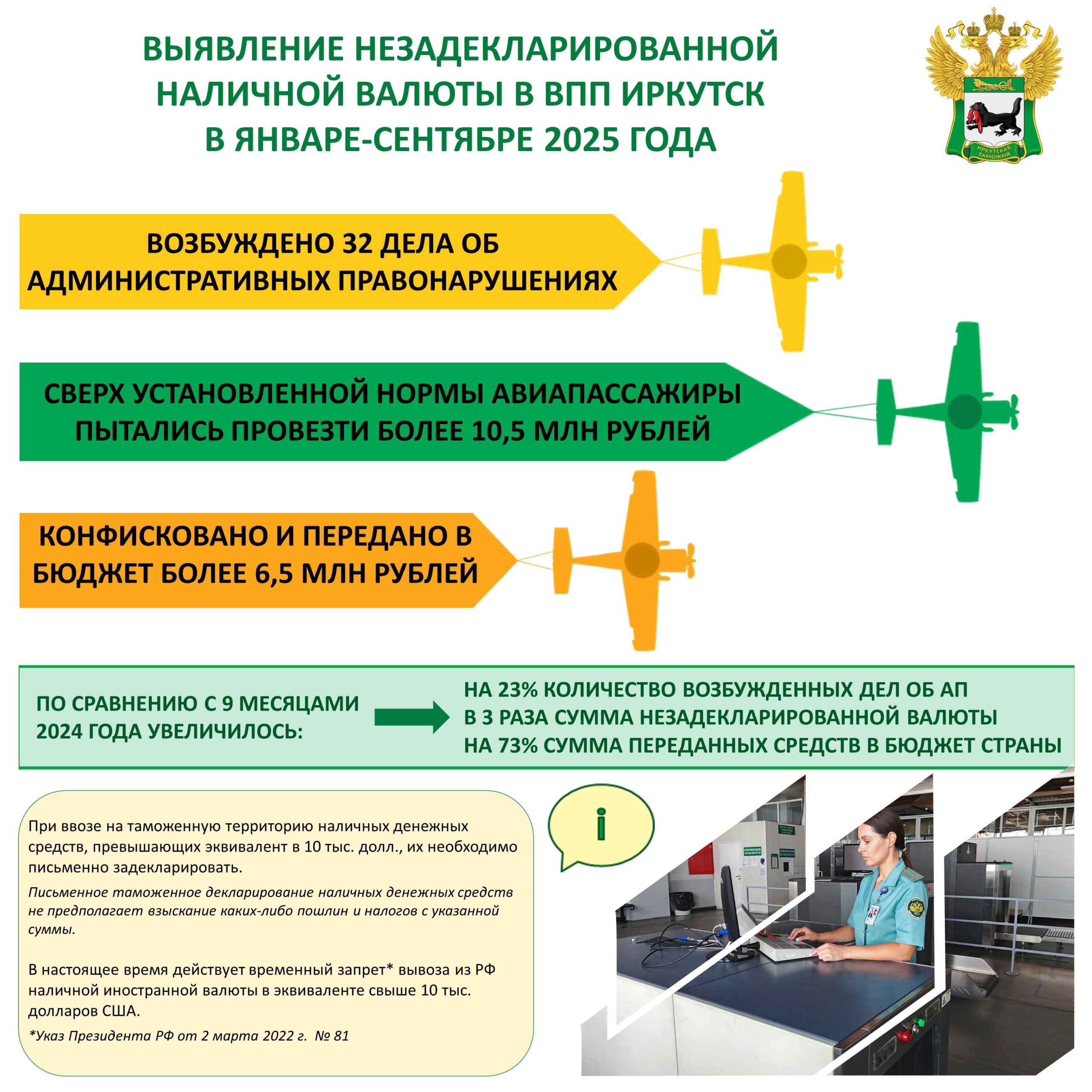 «За 9 месяцев 2025 года сотрудники таможенного поста Аэропорт Иркутск предотвратили 32 факта незаконного перемещения наличных денежных средств, по вступившим в законную силу решениям суда в рамках указанных дел конфисковано и передано в бюджет 6 млн 547 тыс. рублей», – отметила начальник таможенного поста Аэропорт Иркутск Иркутской таможни Альбина Куприна.